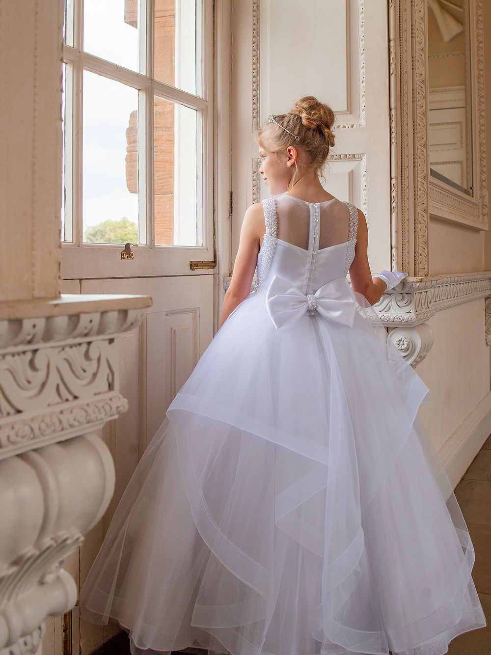 The Starlet Dress by COMO73 features an elegant design crafted from luxurious fabric, adorned with delicate pearl and glass beading. Highlights include a button closure, a bow back, and ruffle skirt detailing, making it a perfect choice for communion or special occasions.