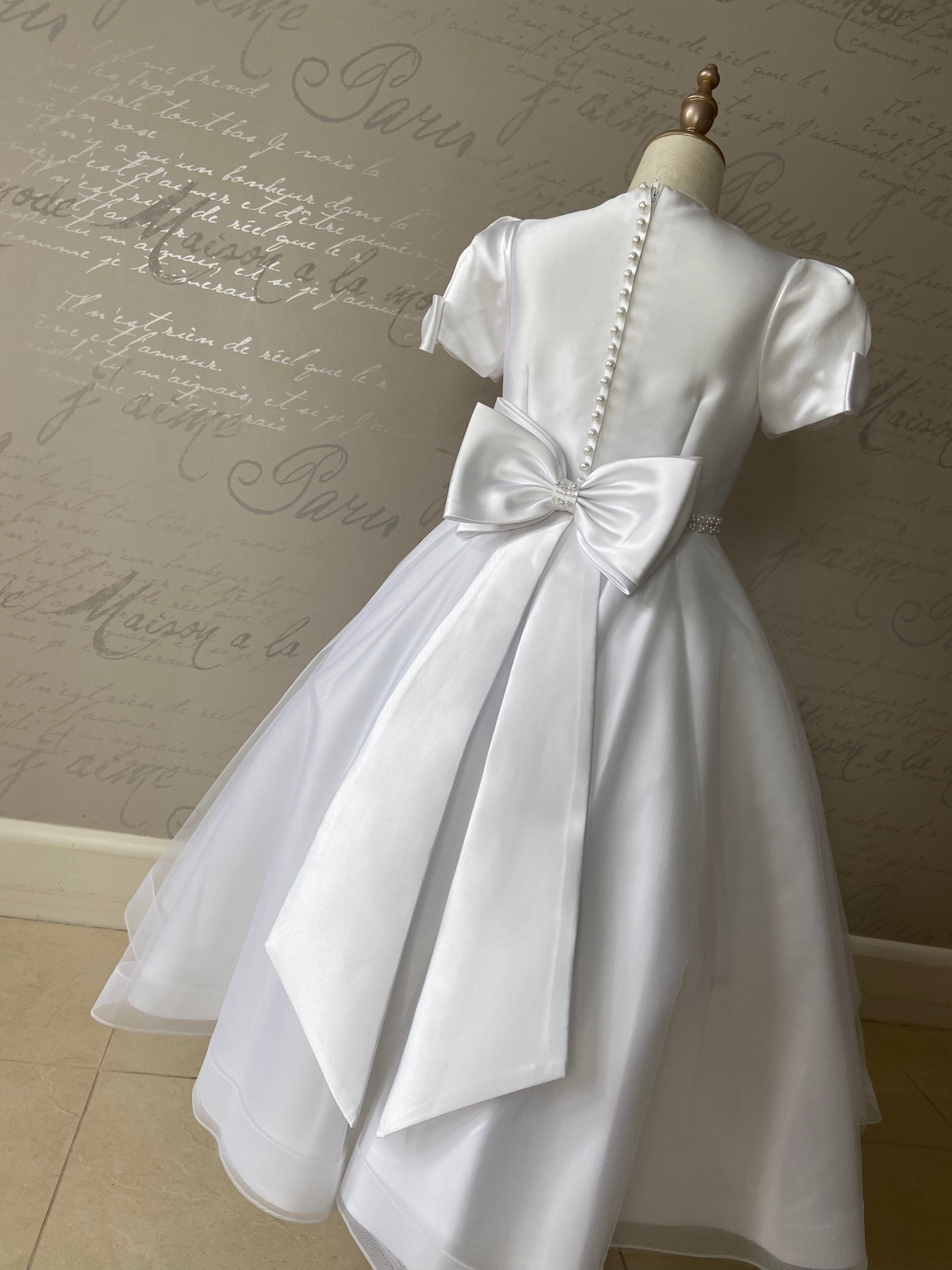 Elevate your little one's special day with the Isabella White Communion Dress. Crafted with a delicate white mikado fabric bodice and complemented by a soft tulle overlay skirt, this dress combines elegance and comfort. Thoughtful details like secret pockets and charming bows on the sleeves and double bow on the back that add a touch of magic while offering practicality. Perfect for creating lasting memories in style and ease.