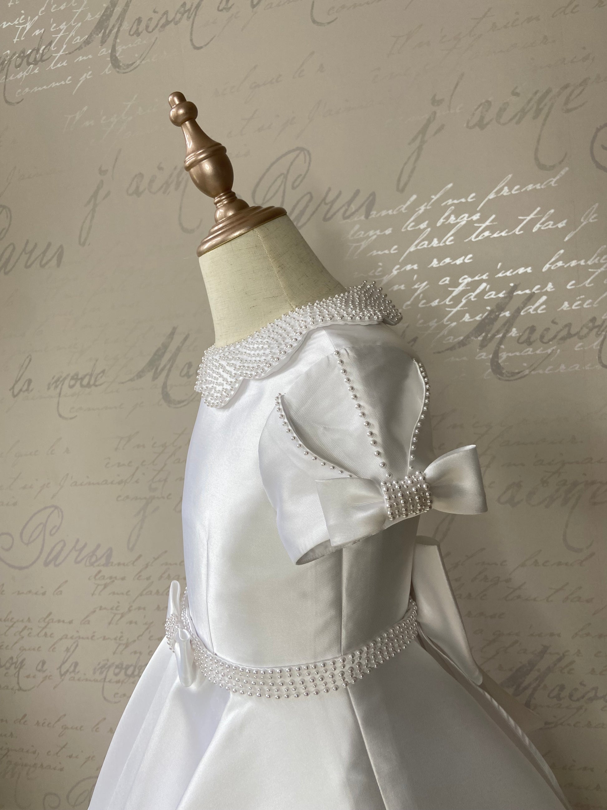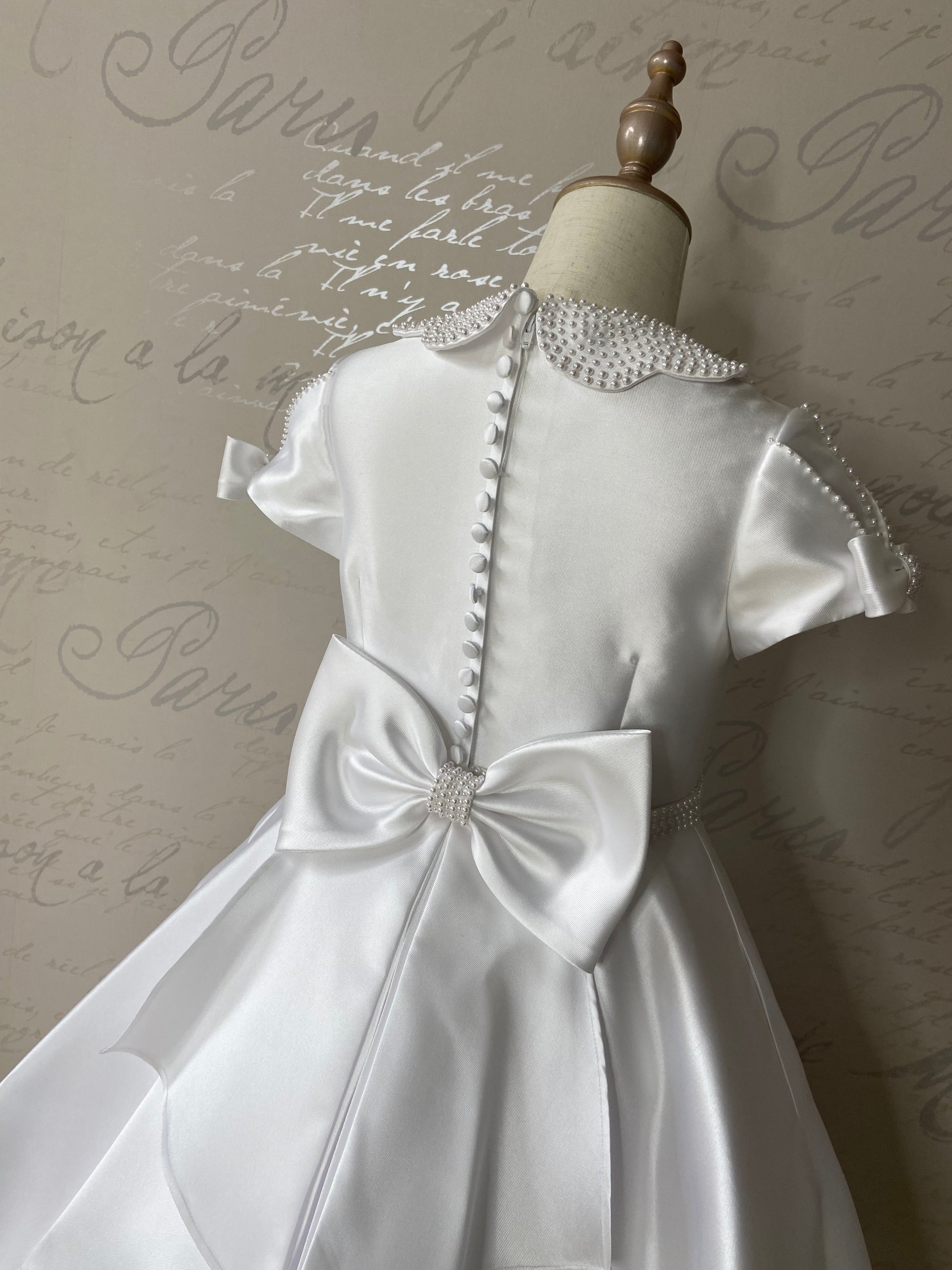 This elegant white ballet length communion dress features a delicate pearl flower-shaped collar that adds a timeless touch of sophistication. Charming bows adorn both the sleeves and the front and back of the dress, enhancing its graceful design. Perfectly crafted for a memorable First Communion, it combines classic style with subtle details to create a truly special outfit for your child's big day.