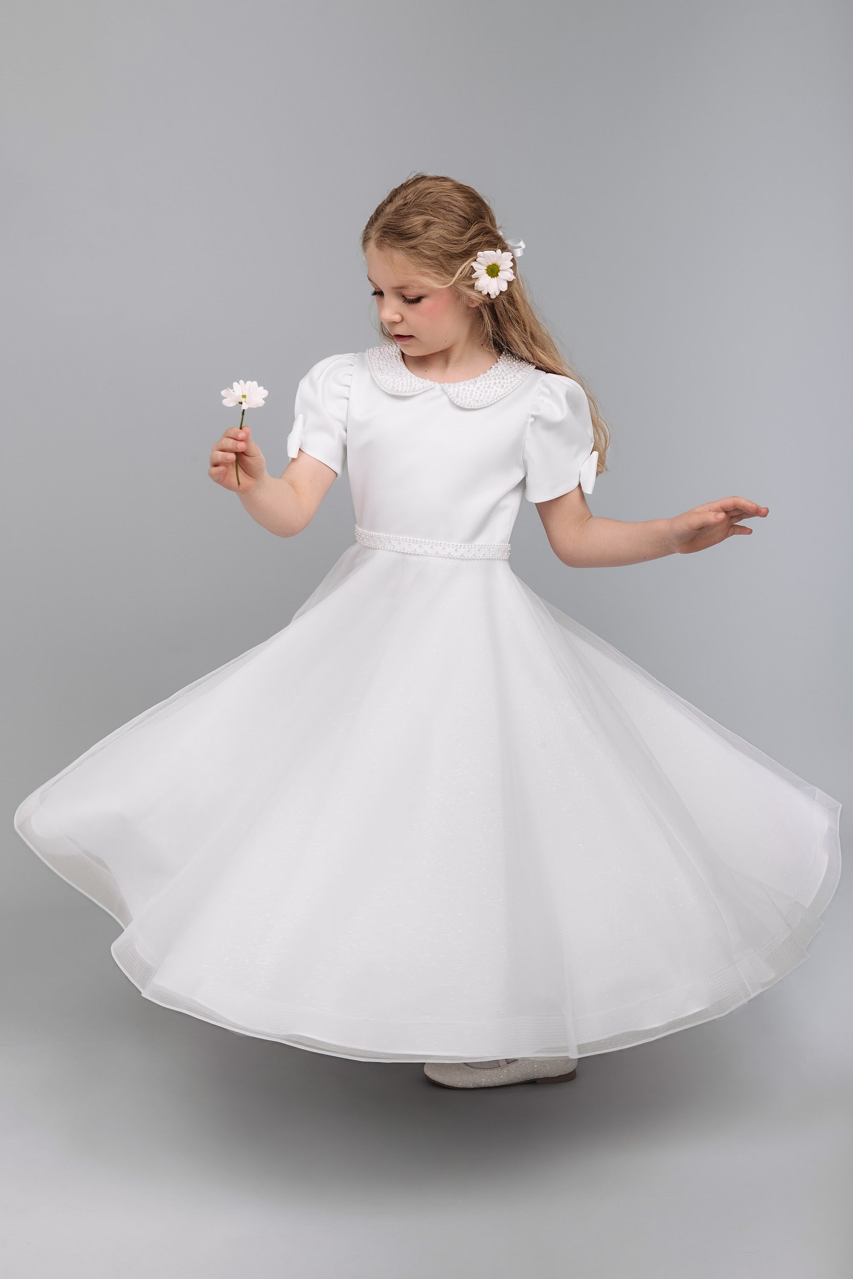 This elegant white communion dress features a charming Peter Pan collar embellished with delicate pearls, adding a touch of sophistication. Dainty bows on the sleeves enhance its sweet, graceful style, while a full-length tulle skirt creates a soft, flowing silhouette perfect for a memorable celebration. Designed to make your child feel truly special on their big day.
