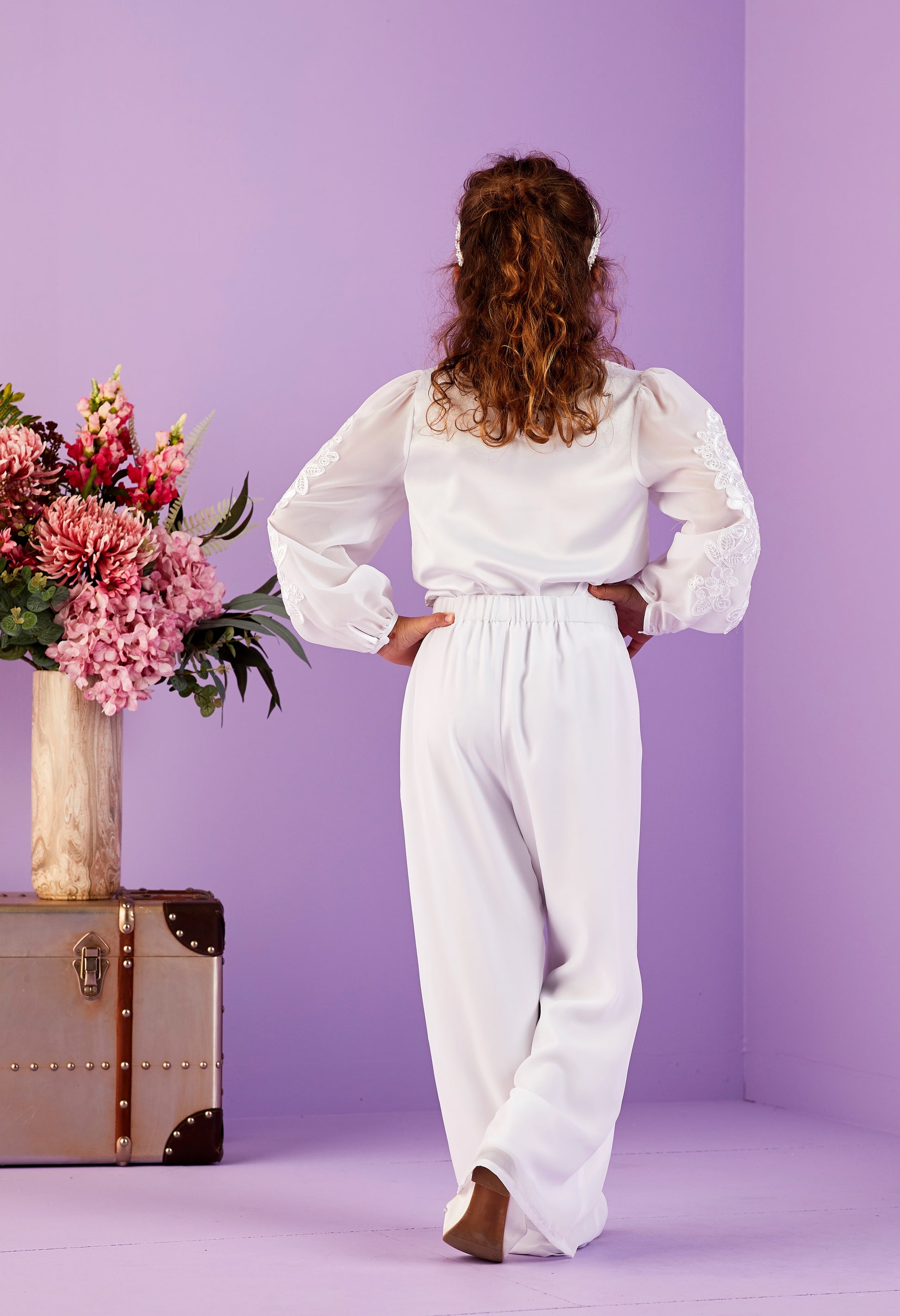 This stunning two-piece set is perfect for girls who prefer not to wear a dress. The gorgeous top features a subtly gathered neckline crafted from soft satin, while the chiffon sleeves boast an eye-catching guipure motif. The sleeves are neatly cinched at the cuffs and secured with a satin-covered button.
