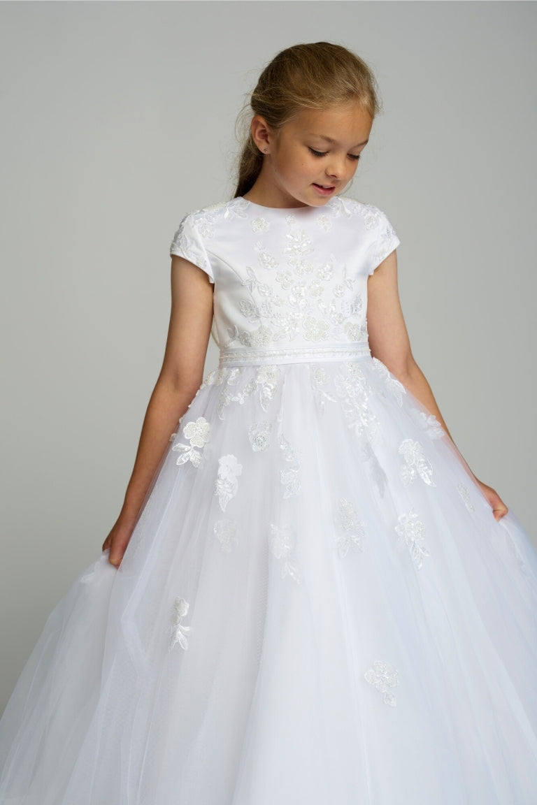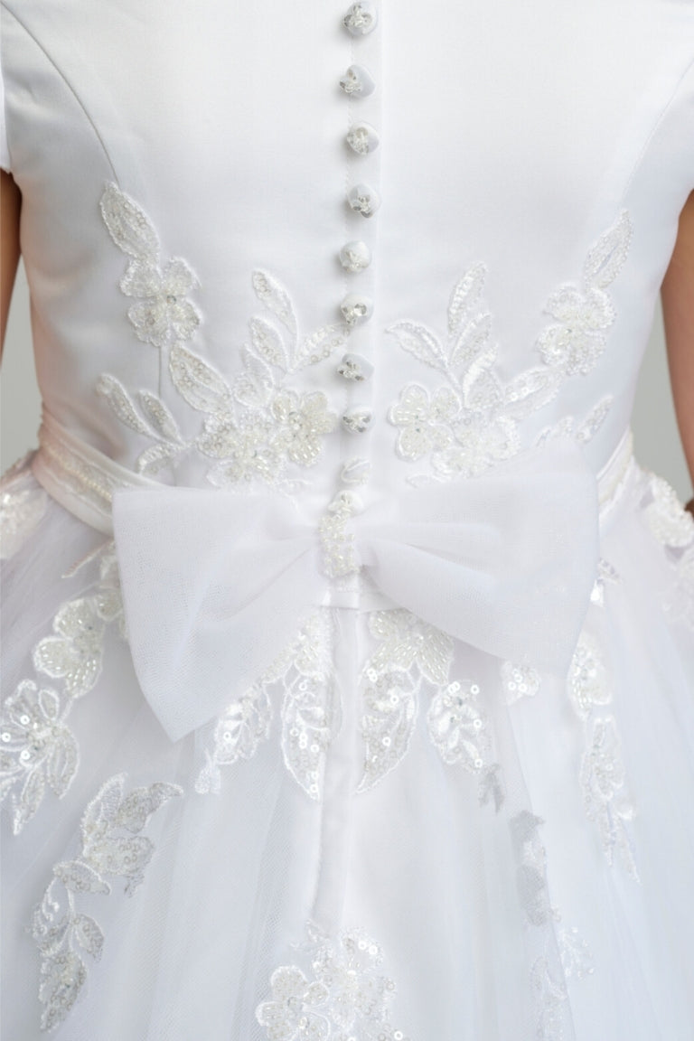This stunning white ballet length communion dress will make a beautiful addition to your special day. With delicate cap sleeves, a charming bow at the back, and a classic poinsettia design, this dress is perfect for any young girl's communion. Feel elegant and beautiful on your special day with this dress!