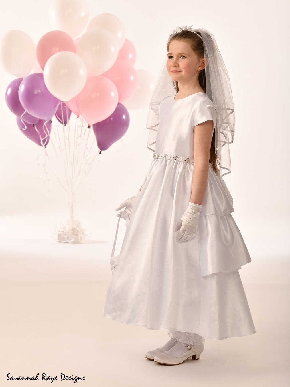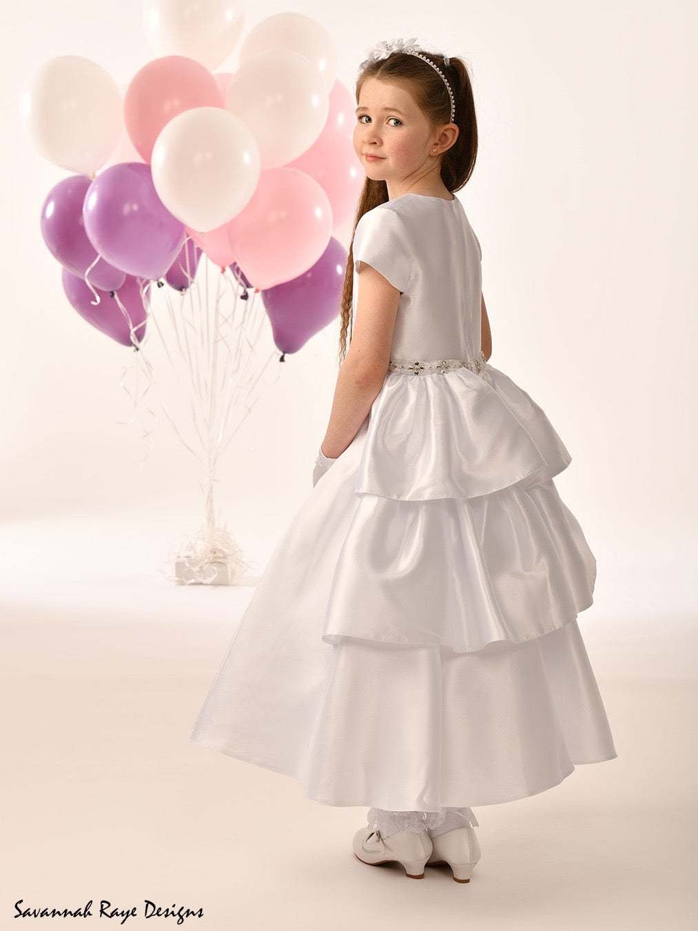 The Savannah Ray - Avery communion dress features a satin white finish and a beautifully layered back skirt. The luxurious material adds a touch of elegance, making it perfect for a special occasion. The layered skirt creates a stunning silhouette and offers a comfortable fit for all-day wear. A must-have for any young fashionista!