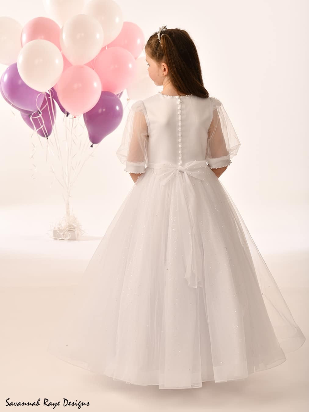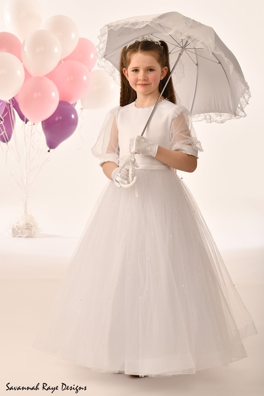The bodice features soft satin with sheer organza puff sleeves, finished with subtle pearl detailing for a touch of sparkle. The full tulle skirt shimmers beautifully in the light, adding a magical, princess-like feel she’ll adore. A satin sash ties neatly at the waist for a flattering silhouette, while matching accessories — including gloves and a lace-trimmed parasol (available separately)