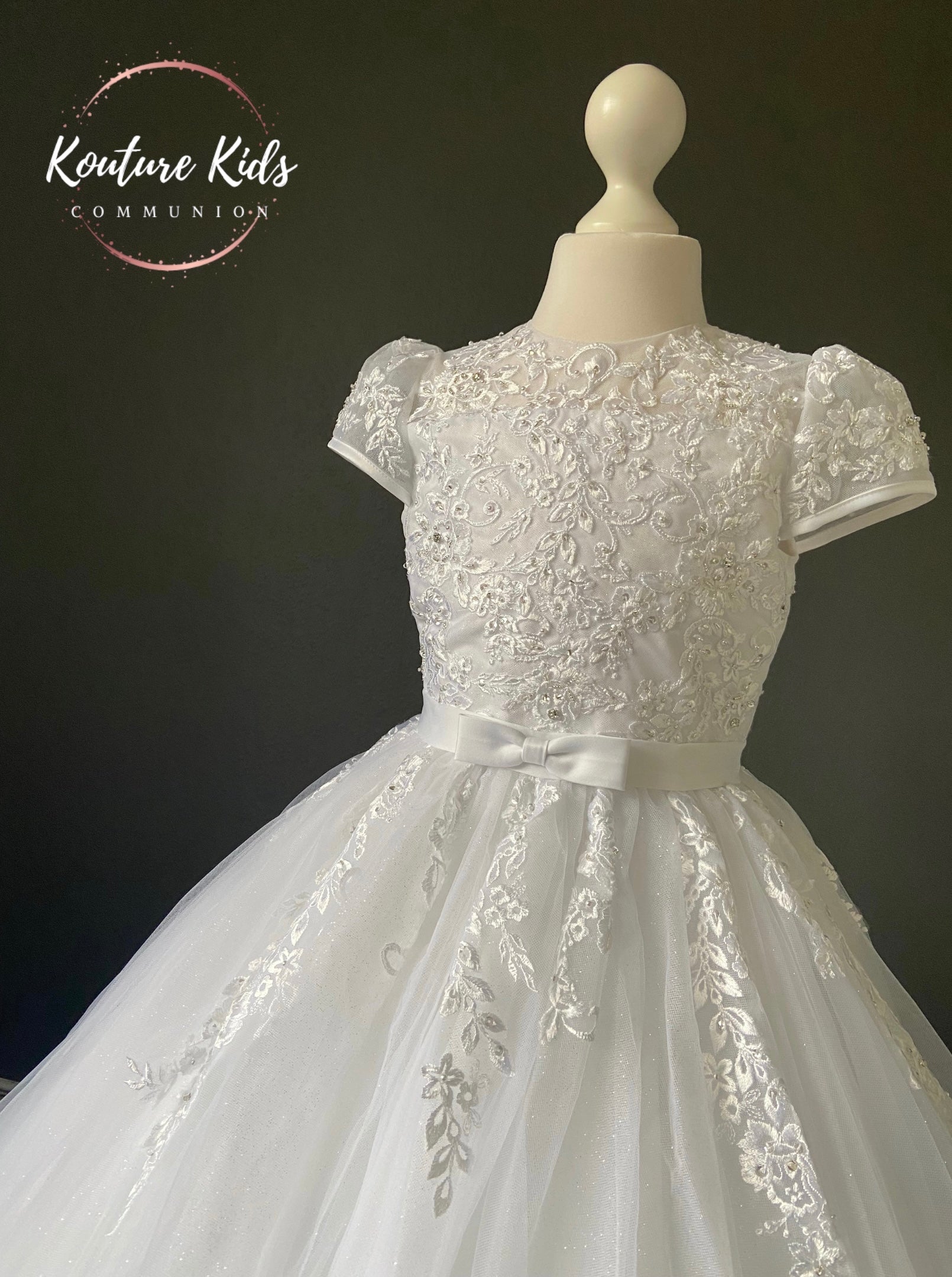 Rosa Bella- RB631 - Be radiant with Sweetie Pie's Rosa Bella white communion dress. Graceful and elegant, this stunning dress will capture your most special day and make her shine. With a touch of romantic lace and dazzling beadwork, this dress will make your little girl look like a princess.
