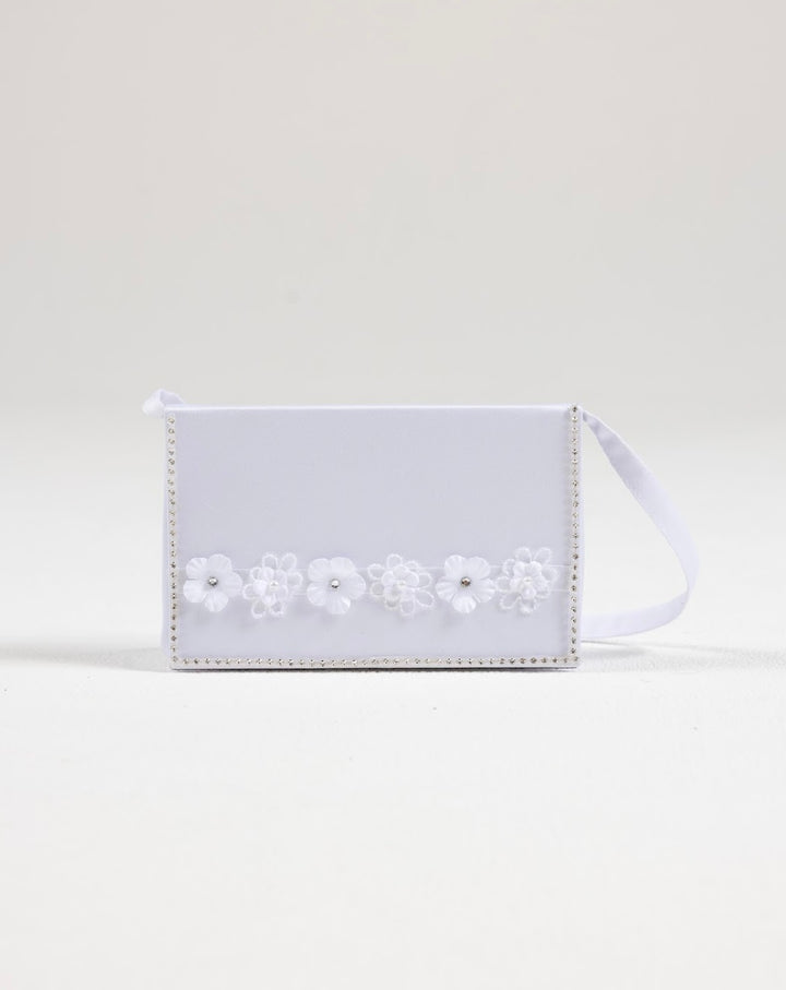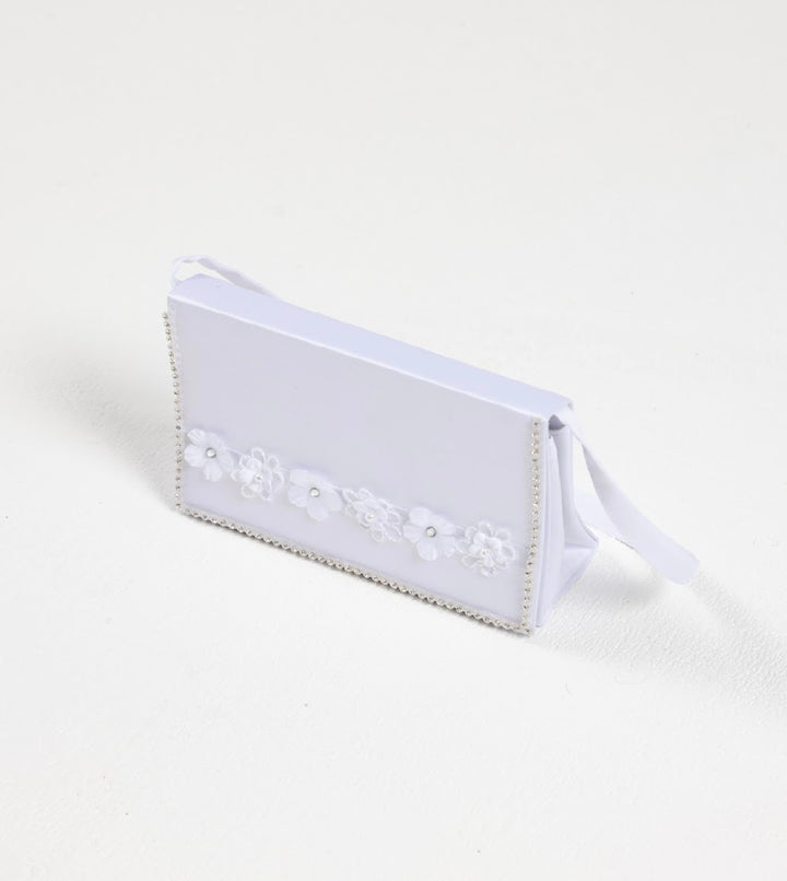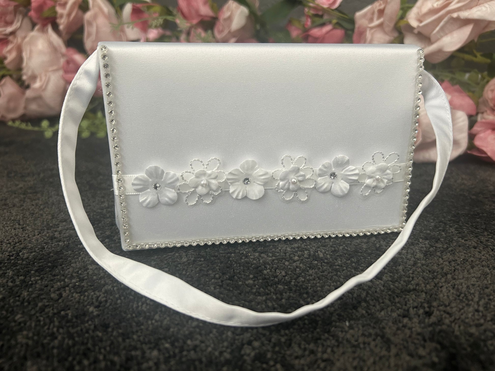 Sweetie Pie White Communion Handbag B4 Trimmed with diamonte and small 3D flowers on ribbon