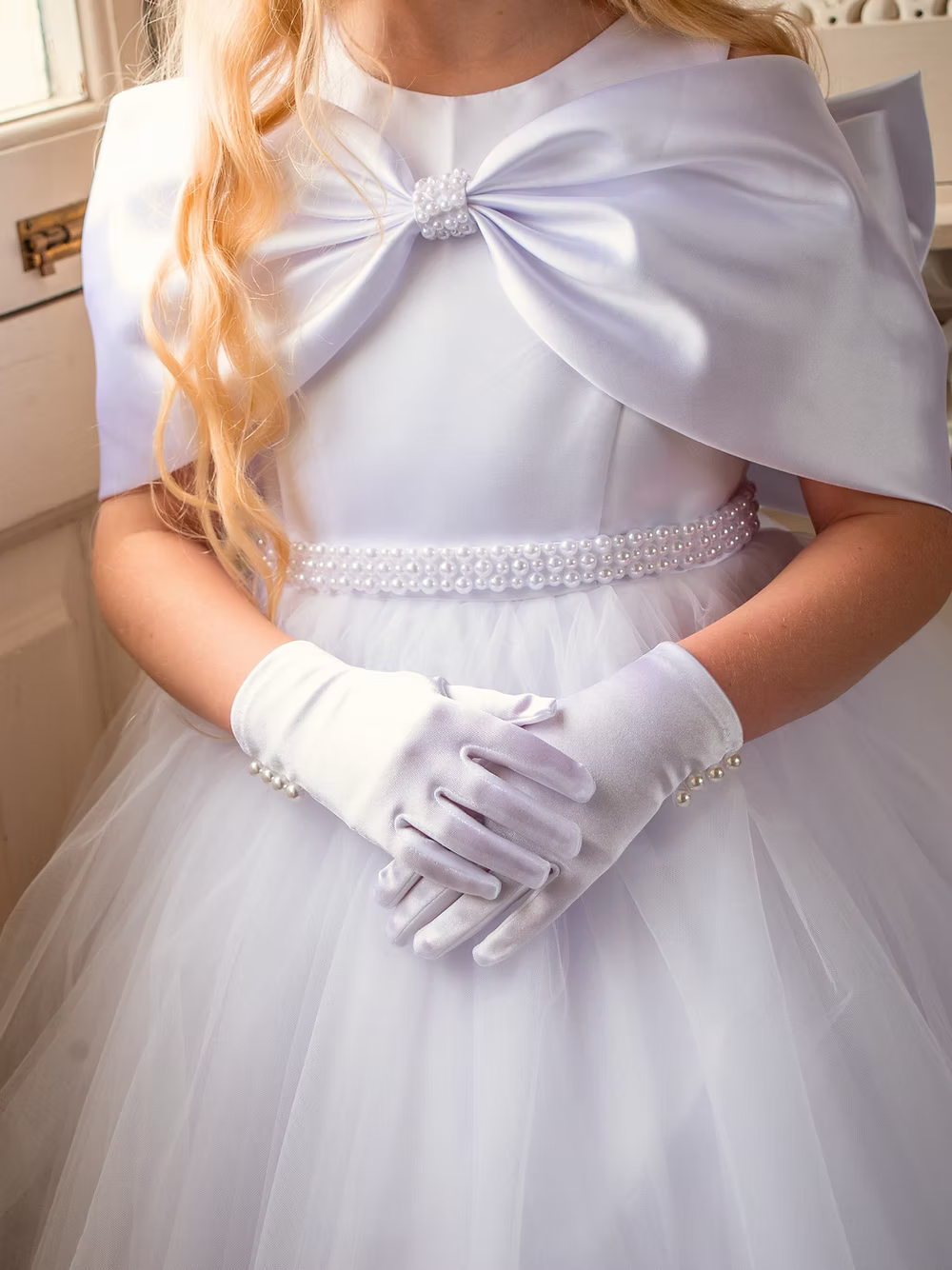 Add elegance and tradition to your child’s First Holy Communion outfit with our handmade white satin communion gloves. Designed by Crystal and Pearl Boutique, these beautiful gloves feature delicate pearl detailing, creating a graceful accessory that perfectly complements any communion dress. Made from soft satin, they provide both comfort and style, making them ideal for communions, weddings, or other special occasions. The subtle pearl accents add a timeless touch, ensuring your child looks polished and radiant on their special day. A classic accessory crafted with care, these gloves are the perfect choice for parents looking for traditional yet refined communion gloves that complete the outfit beautifully.